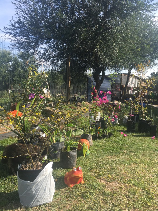 Wir wollen weiter pflanzen! Die letzten zwei Jahre waren die Bäume an der Reihe, jetzt muss Farbe her ! Wir sind extra Richtung Montevideo gefahren. Hier gibt es einige große Pflanzenmärkte mit einer riesigen Auswahl. Wir haben speziell nach Büschen mit leuchtenden Farben gesucht. Einen Busch mit verschiedenfarbigen Blüten haben wir ebenso entdeckt wie eine Pflanze mit zweifarbigen, grünen Blättern. Abwechselnd wachsen hell- und dunkelgrüne Blätter an den Ästen. Das sieht ziemlich abenteuerlich aus, eine Rarität in unserem Garten. Dazu haben wir leuchtende Gerbera, bunte Astern und allerlei andere bunte Blumen gekauft.