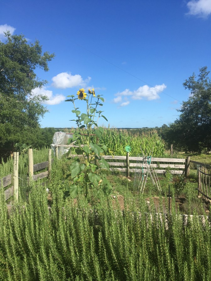 Außerhalb des Beetes haben wir auf 15 Quadratmeter Mais angepflanzt. Die Stauden sind über 2 Meter hoch und wachsen prächtig. Die Ernte sollte als Hasenfutter den Winter über reichen, über das Grünzeug freuen sich die Ziegen.