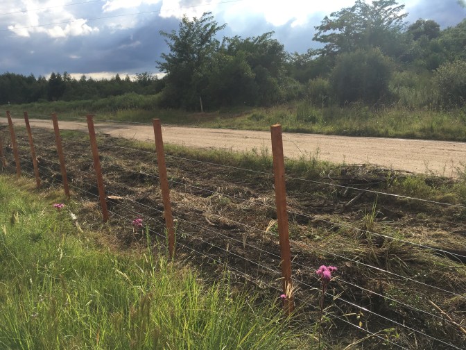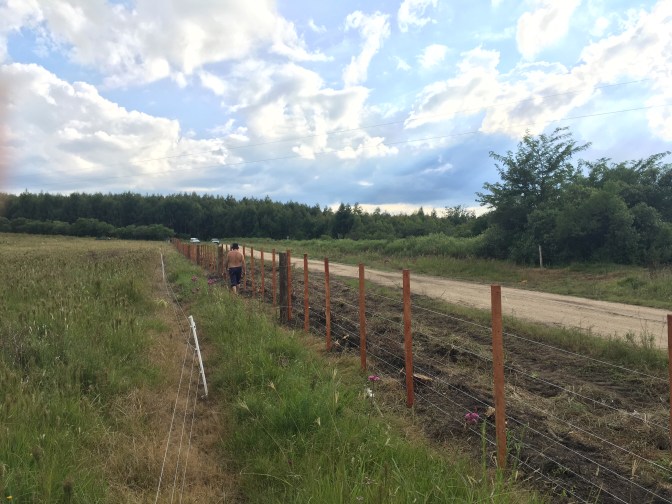 Nachdem auch unsere Ziegen immer wieder einen Ausflug in den Straßengraben unternommen haben, wurde es Zeit für einen neuen Zaun. Im letzten Jahr wurden 250 Meter Zaun an der Grenze zum Nachbarn erneuert. Dieses Jahr war die andere Seite zur Straße hin fällig. Unser Grundstück ist etwa einen Kilometer lang und 250 Meter breit. Da muss immer wieder kontrolliert werden, dass weder Gras noch Büsche in den Zaun einwachsen und Steffen ist oft unterwegs, um die Linien zu säubern.