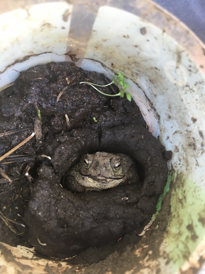 Der Kröte war es draußen wohl auch zu trocken und hat es sich darum lieber in einem der Pflanztöpfe bequem gemacht. Hier wird sie jeden Tag mit Wasser versorgt. Der Lavendelsteckling musste dafür weichen. Der kleine Untermieter scheint sich wohl zu fühlen. Ich wollte ihn schon ein paar Mal vertreiben, nach einiger Zeit saß er allerdings wieder in seinem Topf .