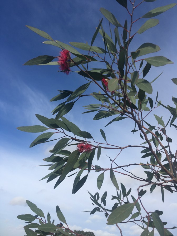 Heute Morgen, nachdem wir die Schafe auf die Weide gebracht hatten, entdeckten wir etwas unerwartetes : kräftig leuchtende, rote Blüten an einem der Bäume! Das war völlig überraschend. Wir hatten noch nie einen blühenden Eukalyptus gesehen, gar nicht gewusst, dass die so herrlich blühen können!