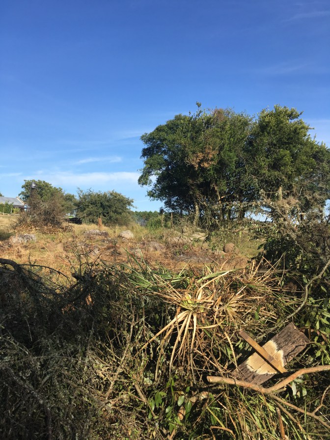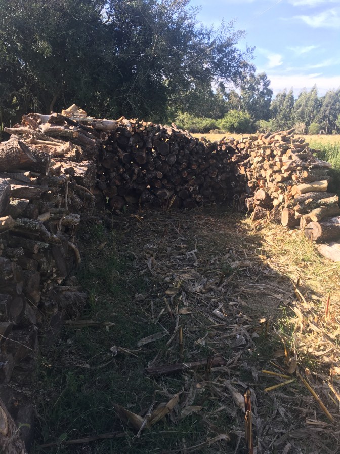Was nicht als Brennholz taugt, wird aufgeschichtet und vor Ort verbrannt. Durch die Säuberungsaktionen gewinnen wir weiterhin immer mehr Weideland für unsere Tiere. Nebenbei entsteht eine schöne Parklandschaft mit sauberem Baumbestand und wunderbaren Ausblicken.