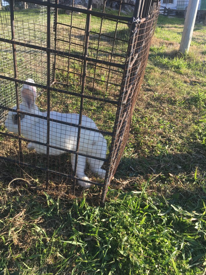 Der weiße Hasenmann wohnt nun in seinem eigenen Stall, hat jeden Tag frisches Gras zum Knabbern und bekommt demnächst eine der Hasendamen zu Besuch. Wir sollten ihn nur tunlichst separat halten, das gäbe sonst nur Streit und Zwietracht im Hühnerstall. Das wollen wir natürlich nicht, also hat er seine eigene Villa.