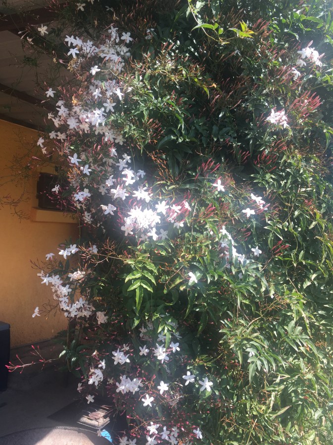 Der Jasmin steht in voller Blüte. Zur Hälfte unter dem Terrassendach, ist er gut geschützt und verströmt einen intensiven Duft. Gestern habe ich den ersten Kolibri gesehen. Er findet noch nicht allzu viel Nahrung. An den Blüten des Jasmin kann er sich schon einmal satt futtern.
