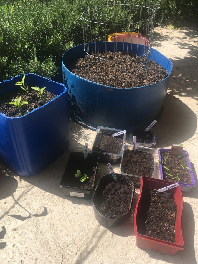 Wenn die Pflänzchen groß genug sind, kommen die Tomaten in die Töpfe. Ich habe die Hoffnung, dass sie dort besser wachsen als im Beet. Die Paprikasamen keimen auch, zusätzlich habe ich einige Pflanzen in der Gärtnerei gekauft. Auch die kommen dieses Mal in den Topf. So hab ich sie besser unter Kontrolle und die Ameisen können sich nicht heimlich in der Nacht bedienen.
