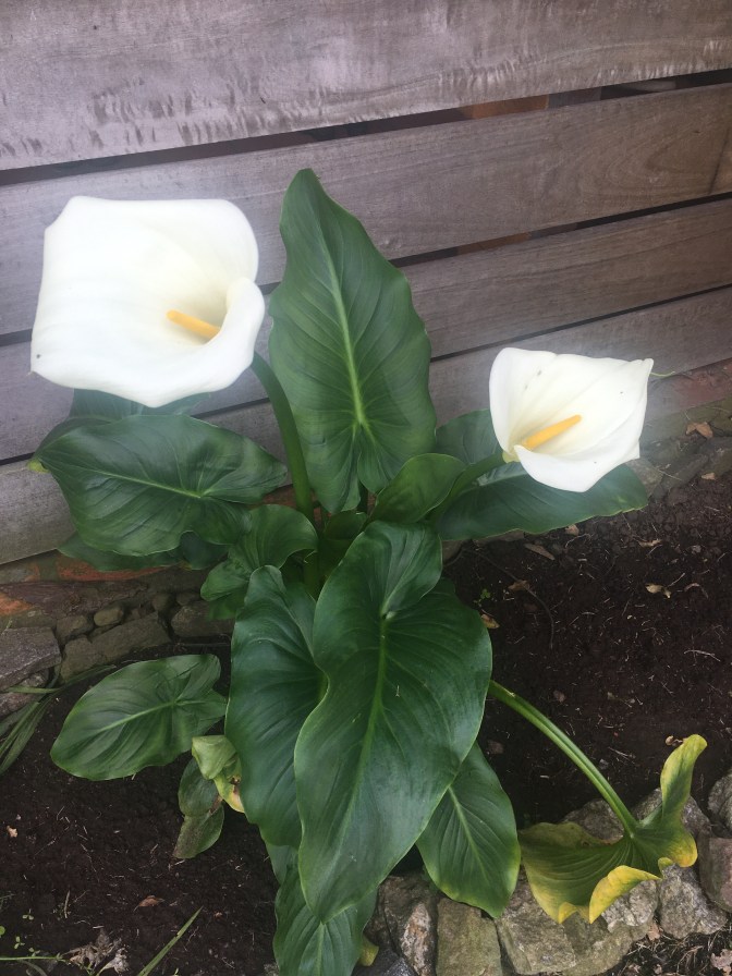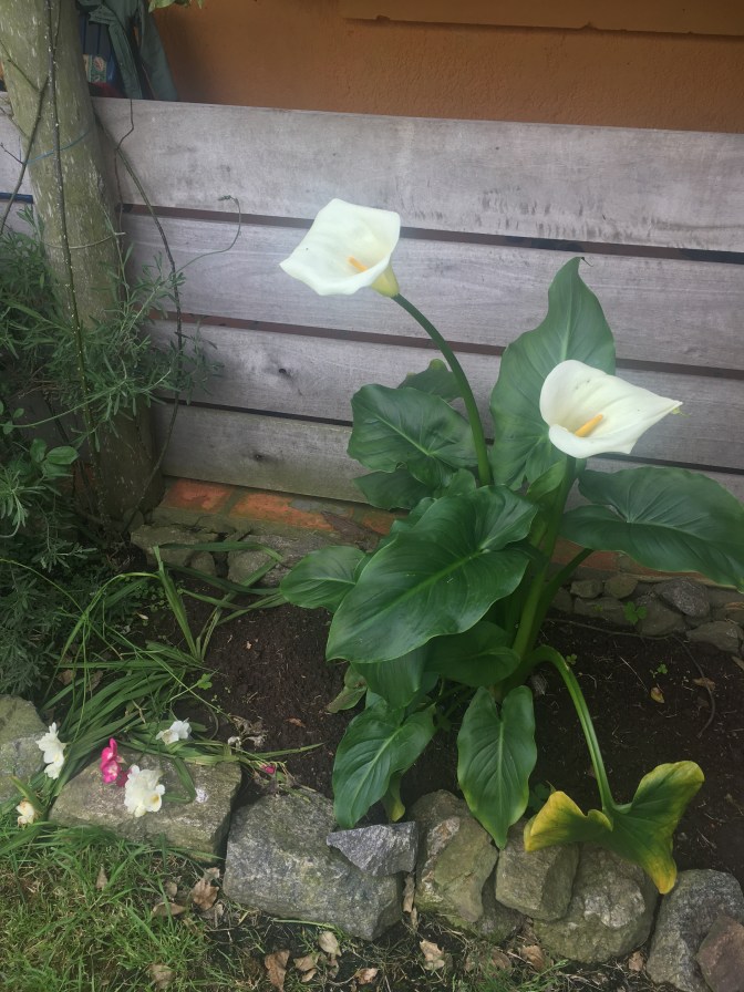 Der Hauseingang liegt zur Südseite. Hinter der Verandabegrenzung ist es immer feucht, die Sonne scheint hier nur im Hochsommer für einige Stunden hin ( Nordseite in Deutschland ). Wir taten uns schwer mit der Bepflanzung. Durch die Feuchtigkeit leiden die Rosen an Mehltau, auch der Lavendel will nicht so richtig. Da kam uns im letzten Jahr die Idee mit den Calla. Wenn die am Straßenrand wuchern, sollte es bei uns doch auch kein Problem sein🤔
