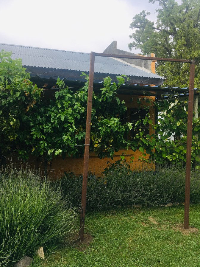 Gestern hat Steffen ein Gestell geschweißt, um unser „Ding aus dem Dschungel“ einigermaßen in Form zu bringen. Die Maracuja-Pflanze ist jetzt zwei Jahre alt und wuchert munter vor sich hin. Wohlgemerkt: die Blätterwand besteht aus nur einer einzigen Pflanze!