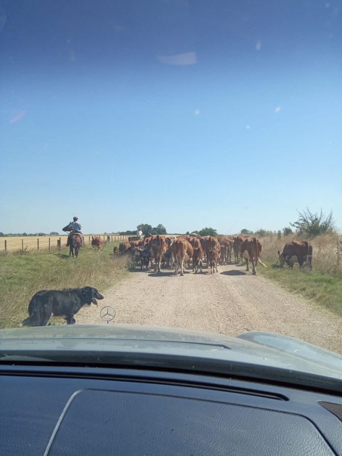 Da ist es praktisch, dass rechts und links alles eingezäunt ist. Die Herde wird in einem Korridor rasch vorangetrieben. Da kann keines zurückbleiben oder gar verloren gehen. Der Gaucho und sein Hund haben alles im Griff.