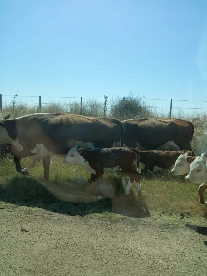 Es kommt immer wieder vor, dass man auf dem dem Weg zum Einkaufen aufgehalten wird. Hier ist es eine Herde von Mutterkühen mit ihren Kälbern, die auf eine andere Weide getrieben werden.