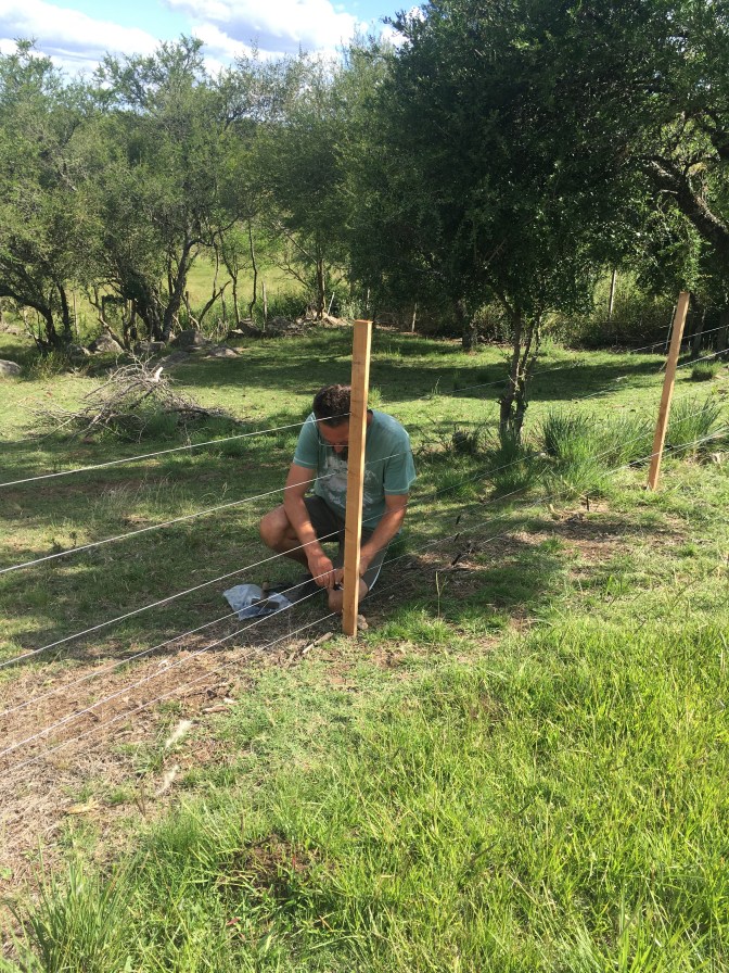 Also war guter Rat teuer; die Lösung dafür letztendlich dann auch! Wir haben 50 Holzpfosten gekauft, um die Zaunseite, an der die Schafe jeden Tag mehrmals durchschlüpfen, zu verstärken. Je enger die Pfosten stehen, desto fester und unbeweglicher ist der Draht. So die Theorie. Stundenlang waren wir beschäftigt, haben in der prallen Sonne schwer geschuftet! Genutzt hat es letztendlich nicht viel. Wir waren noch mit dem Befestigen der letzten Pfosten beschäftigt, als sich ein Stück weiter vorne wieder ein Schaf zwischen den Drähten durchzwängte!!! Das ist für die Tiere ein Spiel. Beschäftigungstherapie sozusagen. Sie spazieren gemütlich durch den Park, fressen hier einen Happen und dort ein Blümchen und warten darauf, dass wir sie bemerken und wieder hinaus jagen. Dann trotten sie gemütlich zur Tür im Zaun, lassen sich wieder auf die Weide geleiten und sobald wir die Tür geschlossen und ihnen den Rücken zugewendet haben, beginnt das Spiel von neuem. Frustrierend. Wenn sie weiter ausbrechen, wird uns nichts anderes übrig bleiben als sie zu verkaufen, bevor noch andere Schafe ihrem Beispiel folgen.