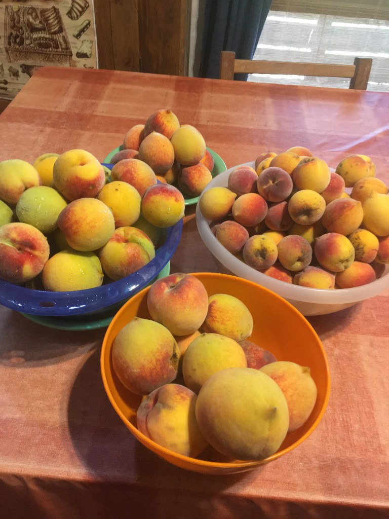 Unsere Pfirsichbäume sind noch zu klein, als dass sie solch eine Pracht an Früchten bringen würden. Aber die Bäume der Nachbarin sind dieses Jahr eine wahre Augenweide! Die Äste biegen sich unter der schweren Last und die gute Frau weiß nicht mehr wohin mit den vielen Pfirsichen.