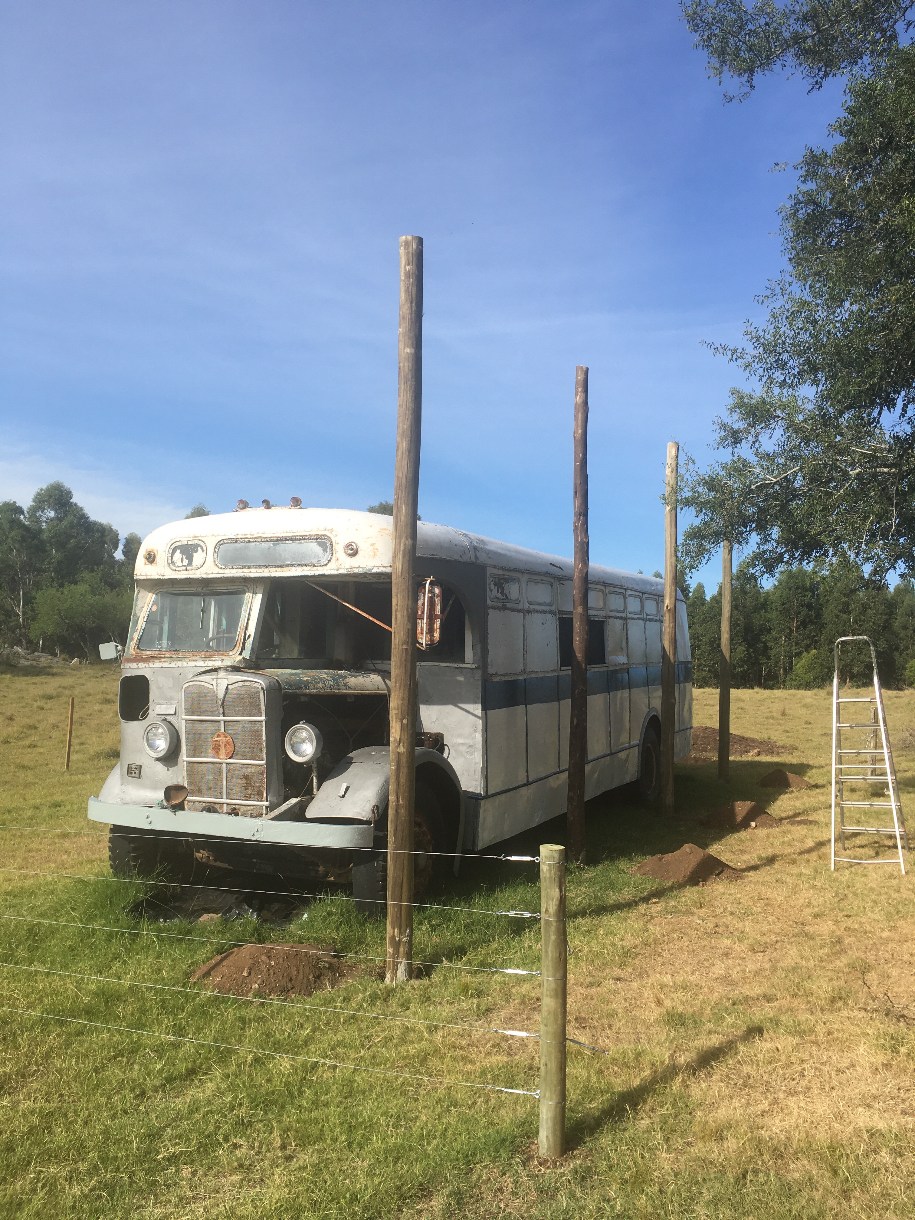 Jetzt kann es losgehen. Acht Pflöcke für das Dach werden gesetzt und bekommen einen Betonfuß, damit sie auch sicher stehen. Die zwei Gartentürchen rechts und links vom Bus werden geschweißt, danach wird der Zaun rundherum vollendet und wir können schon einmal zwei Bäume als Schattenspender pflanzen. Die sind dann sicher vor den ständig hungrigen Ziegen.