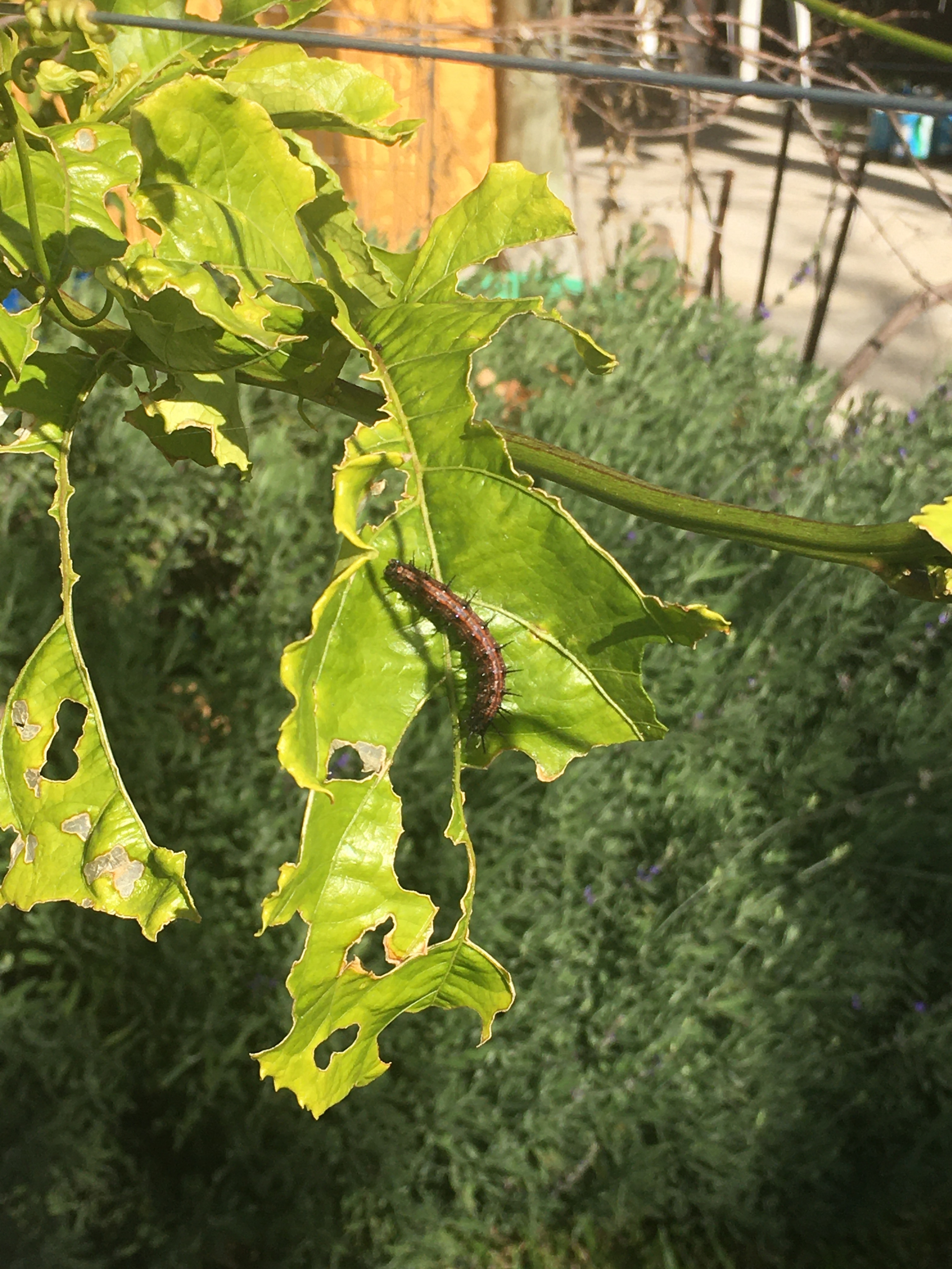 Unzählige Raupen vertilgen die Blätter vom Maracuja-Strauch, die noch immer saftig grün sind.
