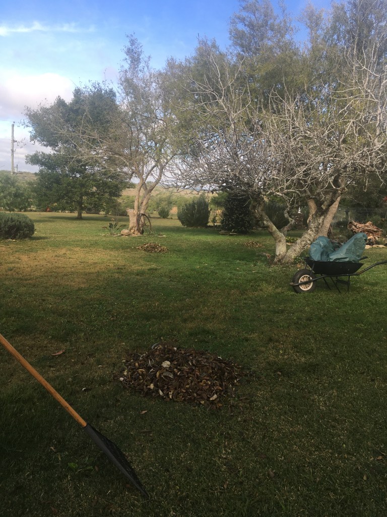 Bevor sich die nächste Gewitterfront nähert, kehre ich heute das Laub zusammen. Ein Teil davon kommt auf den Komposthaufen. Die überwiegende Menge landet allerdings zusammen mit dem Mist aus dem Hühnerstall und den Schafköddeln auf dem großen Misthaufen. Hier wird auch Baum- und Heckenschnitt aus dem Park gesammelt. Einmal im Jahr wird das ganze dann angezündet. Die Asche und Erde kommen dann wieder als Dünger in die Rabatten des Parks.