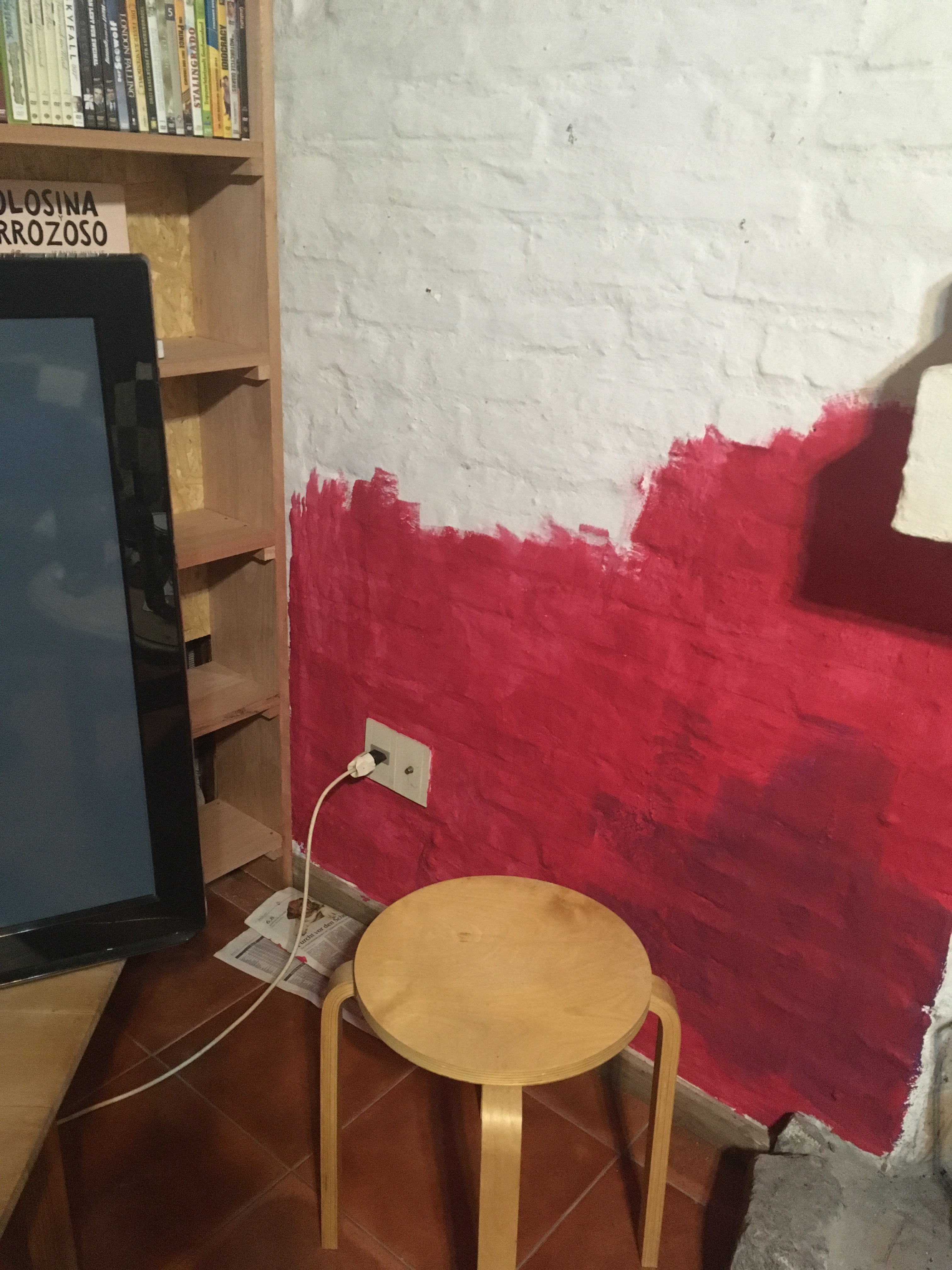 Wir werden nächste Woche weiße Farbe kaufen und danach mit einer dezent gelben Farbe darüber streichen. Irgendwelche Farbexperimente werden wir in Zukunft bleiben lassen.
