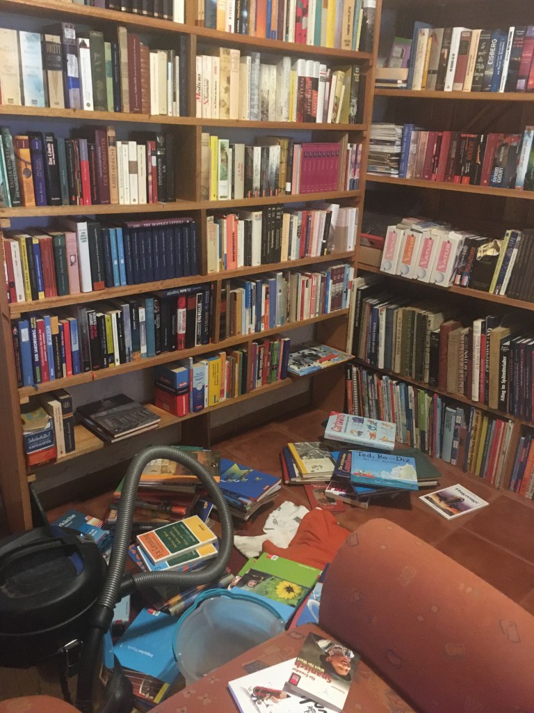 Einmal in Jahr wird in der Bibliothek richtig sauber gemacht. D.h. : jedes einzelne Buch wird in die Hand genommen, mit dem Staubsauger entstaubt und zur Seite geräumt. Immer einen halben Regalmeter lang. Danach wird das Holzbrett gesäubert und die Bücher wieder eingeräumt. Das dauert Stunden. Deshalb warte ich immer, bis mich der Putzfimmel packt. Weil ich nicht immer beim putzen bleibe, sondern zwischendurch immer wieder gerne in den Büchern blättere und lese. Manchmal bin ich dann ganz erstaunt, welchen Schatz ich gerade wieder entdeckt habe. Bei fast 3500 Büchern kann es schon mal vorkommen, dass ich das ein oder andere Buch vergesse. In der Regel weiß ich aber ganz genau, wo welches Buch steht.