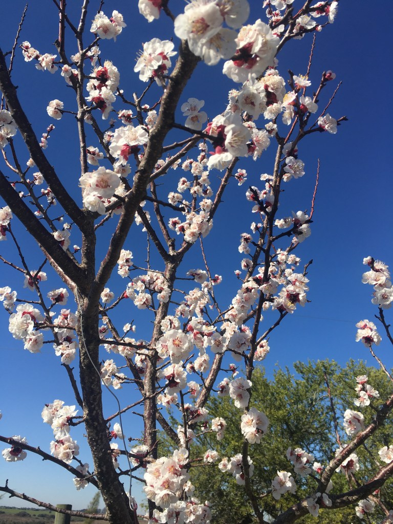 Vor drei Wochen standen die Aprikosenbäume in voller Blüte. Das Wetter war uns seitdem sehr gesonnen. Die Nachtfröste halten sich bis heute in den Niederungen. Da ist es jeden Morgen weiß vom Raureif. Davon sind wir hier oben auf dem Hügel verschont geblieben. Die Bienchen haben ihre Arbeit hervorragend gemacht. Jetzt hängen die Bäume schon voll mit kleinen Früchten.