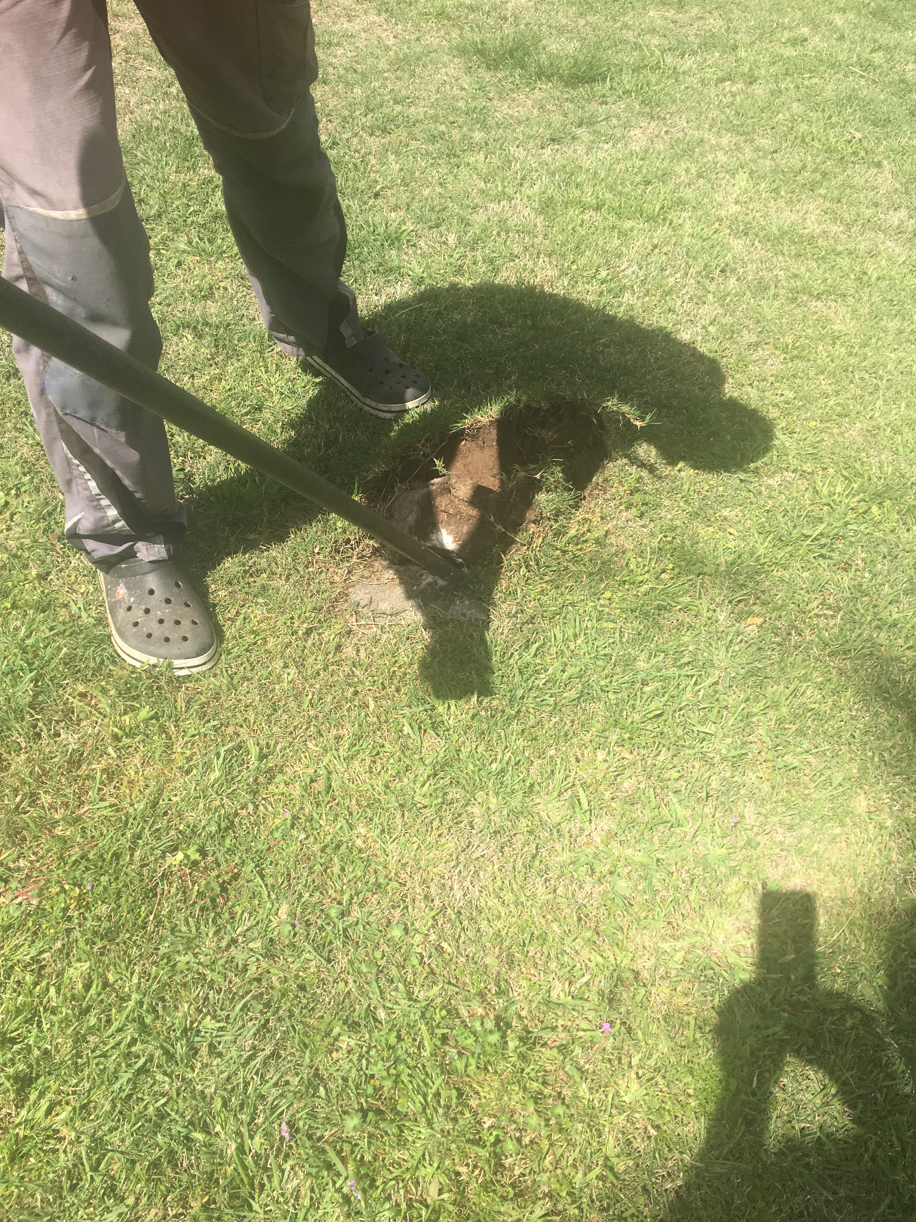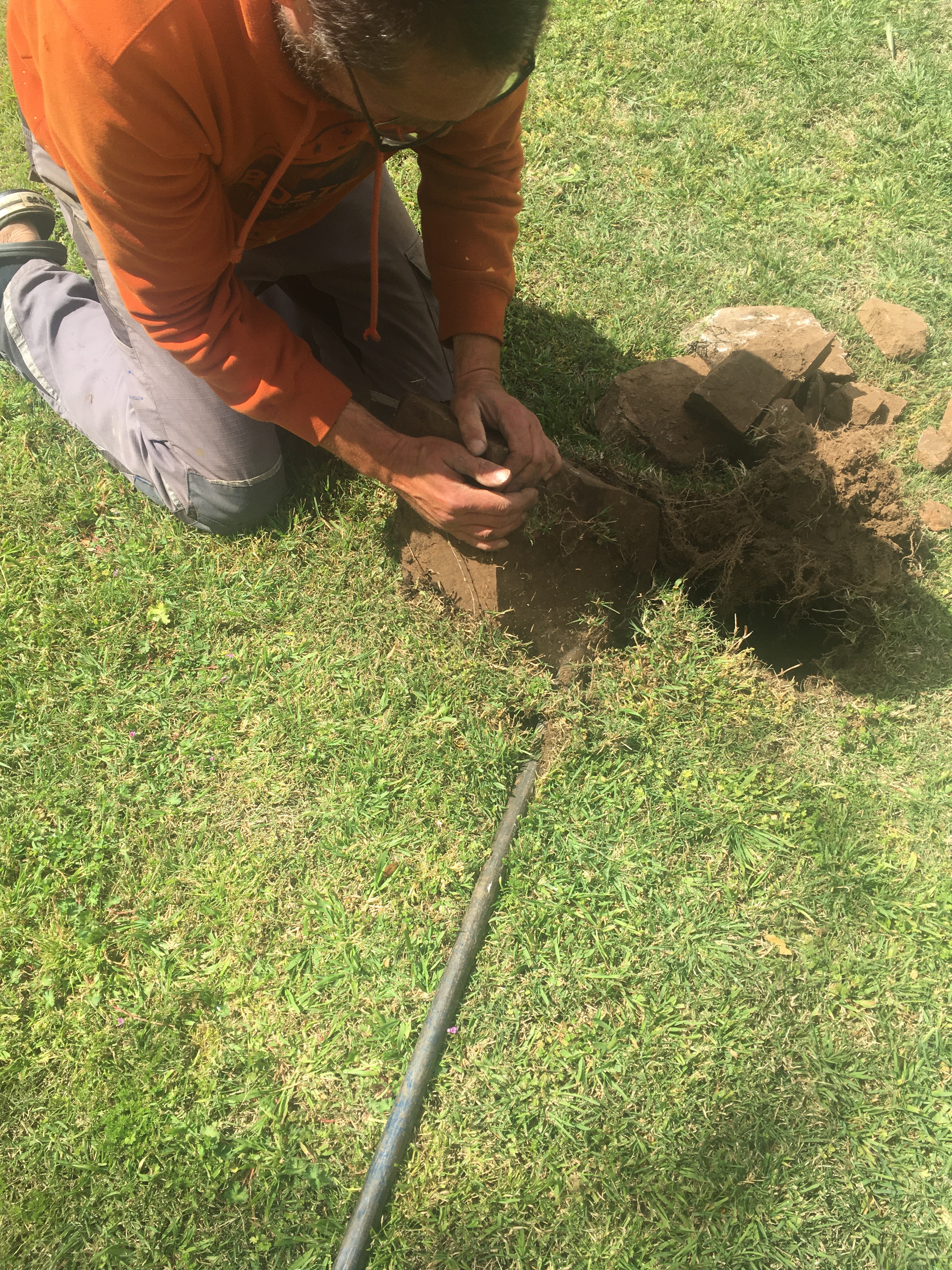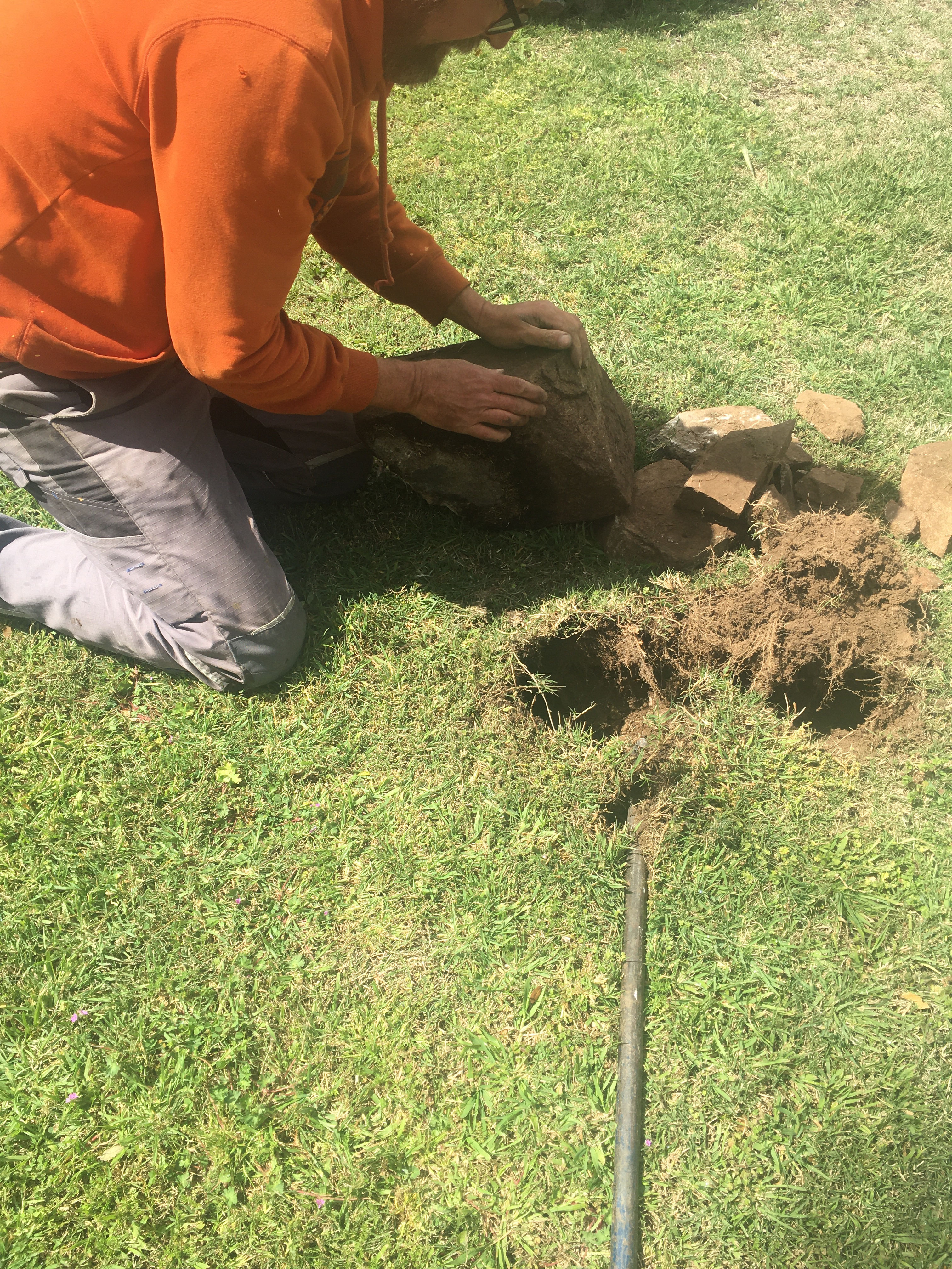 Mit der großen Eisenstange wird dann versucht, den Stein zu entfernen. Manchmal klappt es relativ gut, manchmal müssen wir allerdings kapitulieren! Wenn der kleine Stein, der aus der Wiese schaut, sich in der Tiefe nämlich als Felsformation entpuppt. Dann müssen wir uns etwas anderes einfallen lassen.