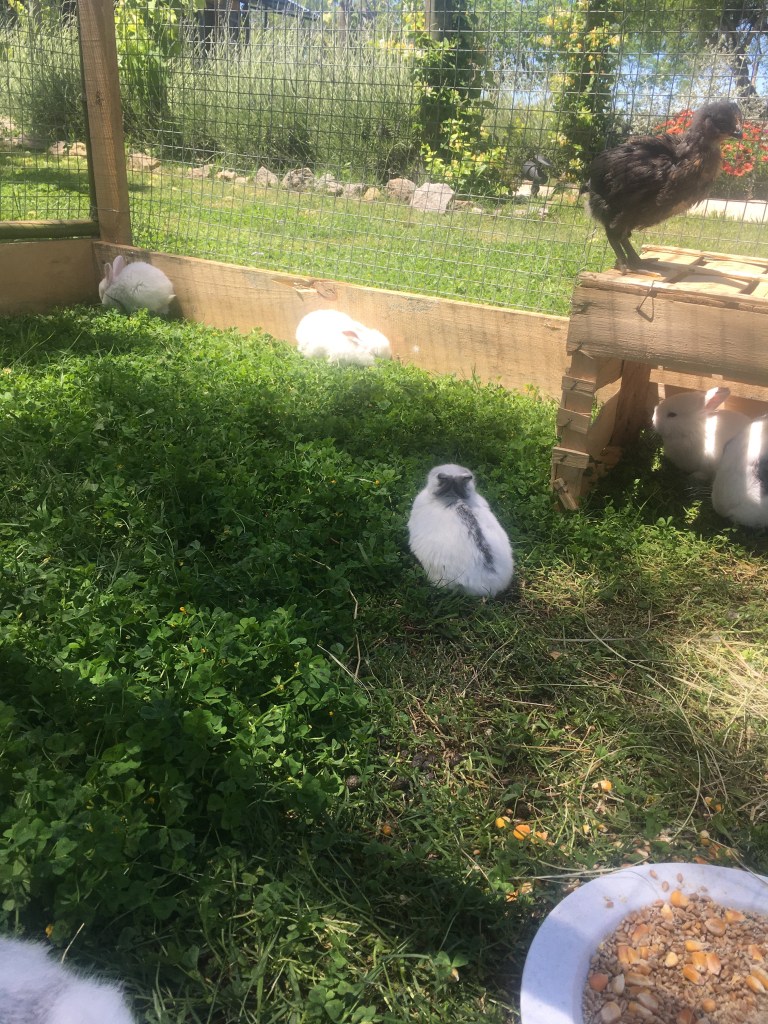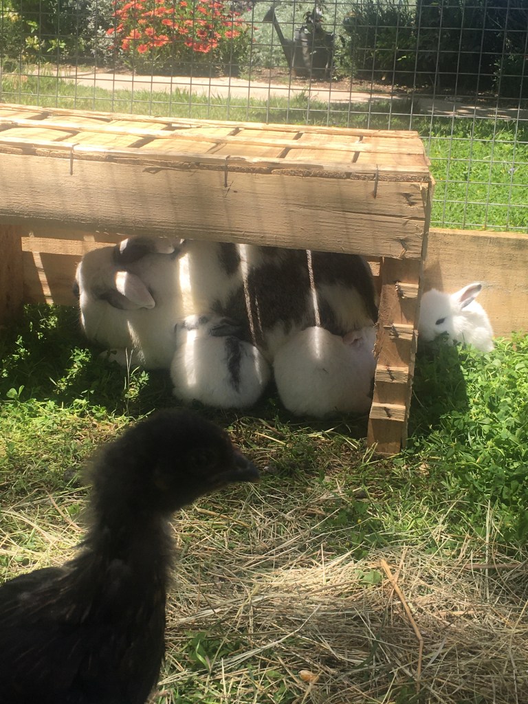 Wenn die Kleinen etwas größer sind, müssen wir sie allerdings verkaufen. Für acht große Hasen ist das Gehege zu klein. Letztendlich werden dann nur noch das Küken und der mittlere Hase darin wohnen. Sie sind zusammen aufgewachsen und aneinander gewöhnt. Das Küken kennt nur die Hasen als Spielkameraden und wird sich mit den neuen Hühnern kaum verstehen. Und ich will nicht komplett auf meine Häschen verzichten!