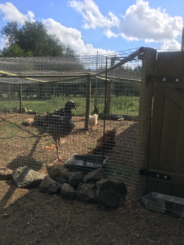Fünf neue Hühner und ein Hahn sind wieder bei uns eingezogen. Der Hahn hat sich gleich mit einem herzhaften „Kikeriki“ bemerkbar gemacht. Er und seine Damen scheinen mit ihrer neuen Behausung zufrieden zu sein. Der Chajà hat mit der Eingewöhnung noch seine Mühe, durfte er sich doch die letzten zwei Wochen tagsüber fast frei im Gelände bewegen. Das erscheint uns auf Dauer wenig sinnvoll. Er hat nur einen Flügel und ist dadurch flugunfähig. Und wenn er auch ziemlich groß und wehrhaft ist, hat er einem größeren Raubtier wenig entgegenzusetzen. Wir wollen ihn nicht auch noch verlieren.