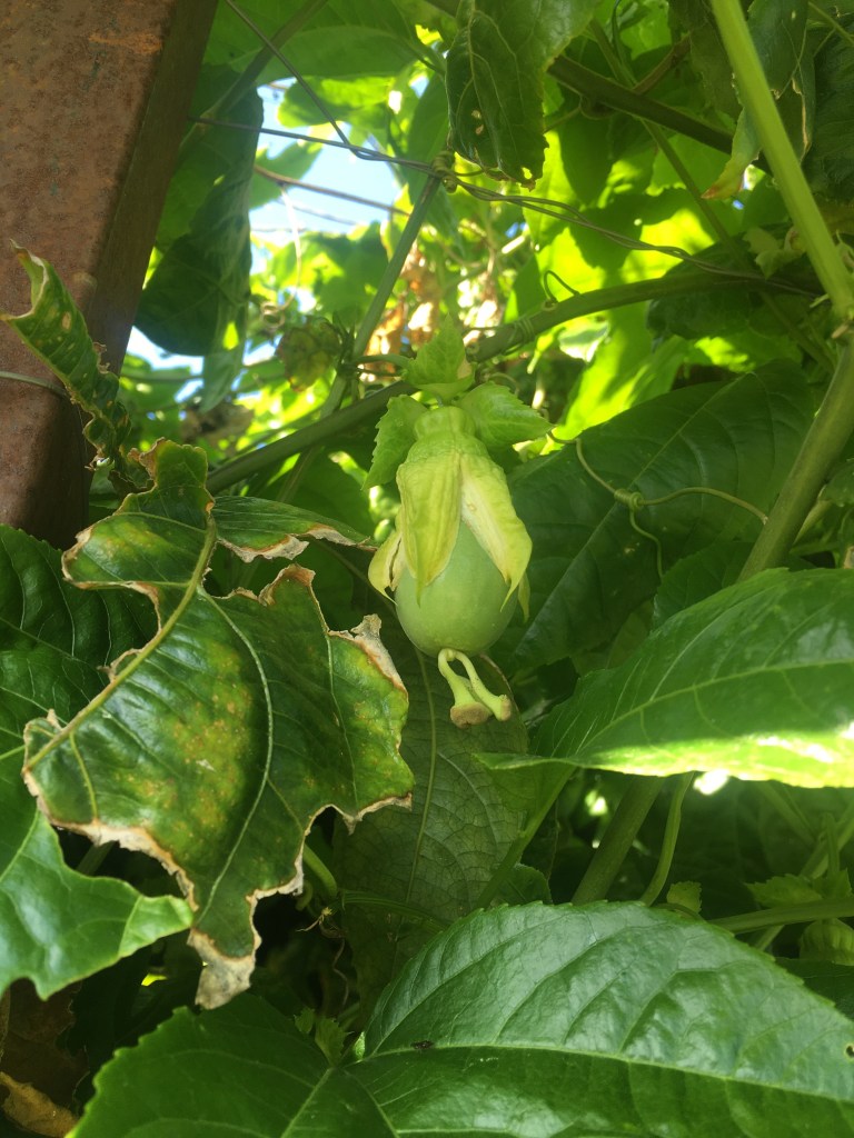 Unser Maracuja-Gewächs blüht wieder. Die wunderschönen Blüten locken allerlei Insekten zum Bestäuben, sodass es überall summt und brummt. Jeden Tag öffnen sich neue Blüten, aus denen nach kurzer Zeit die Früchte wachsen.