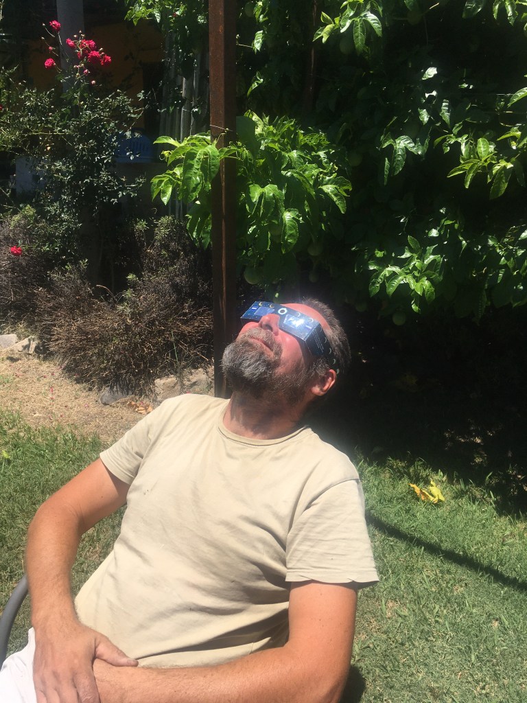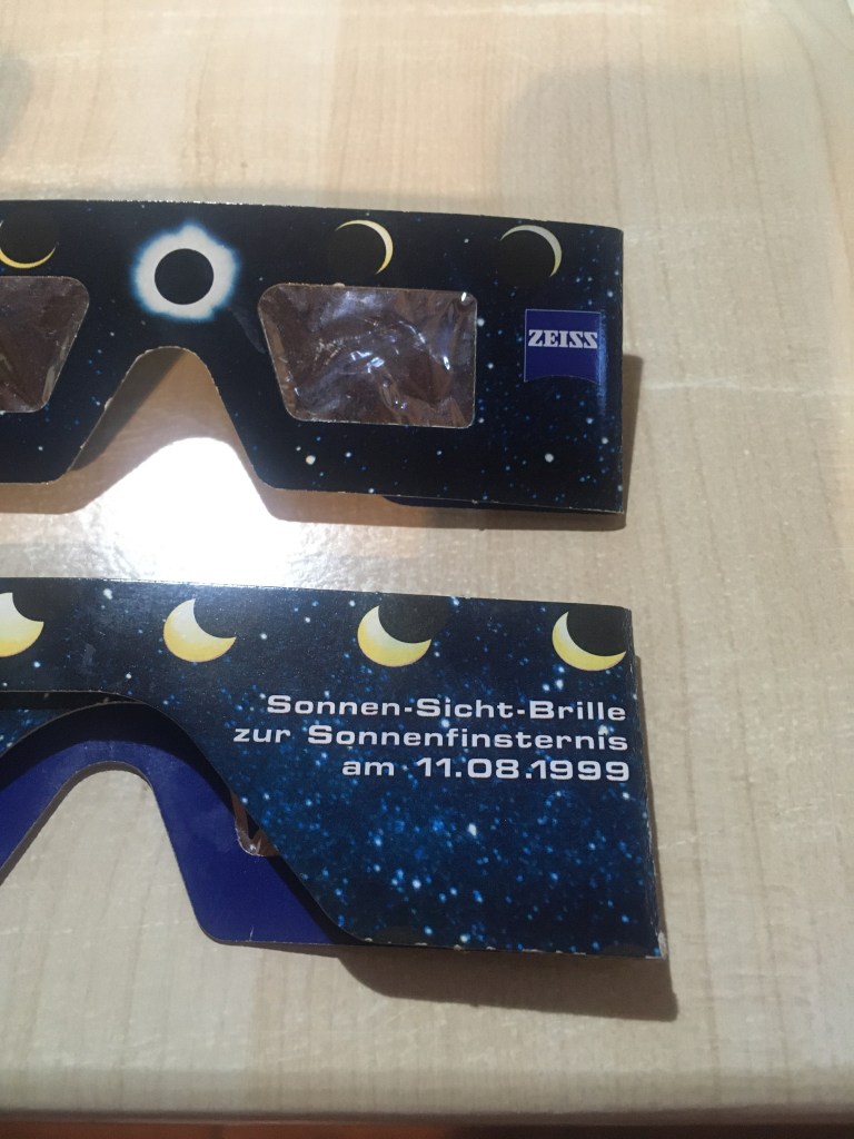 Seit dem 11.08.1999 sind die Brillen in unserem Besitz und haben einige Umzüge, inklusive der Auswanderung nach Uruguay, unbeschadet überstanden. Im August 1999 durften wir eine komplette Sonnenfinsternis im Pfälzer Wald miterleben, heute hat es dafür nicht ganz gereicht. Während der Mond sich langsam vor die Sonne schob, nahm die Sonnenintensität deutlich ab. Zur Mittagszeit brannte die Sonne bei 32 Grad recht unangenehm auf der Haut, kurz nach 13 Uhr kühlte es dagegen merklich ab, obwohl die Sonne weiter schien. Dunkel wurde es leider nicht. Ein schmaler Streifen der Sonne blieb frei und versorgte uns mit ausreichend Licht.