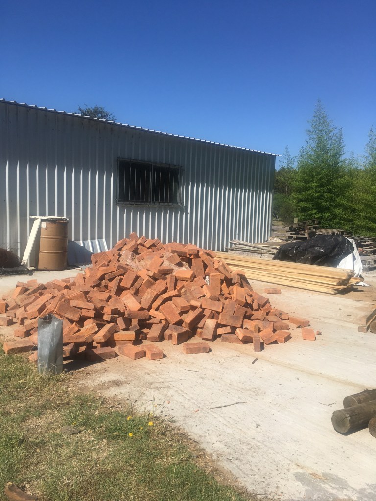 Es sind erstaunlicherweise sehr wenig Ziegel kaputt gegangen, vielleicht etwa 20 Stück. Die können wir später bei den Maurerarbeiten mit vertun. Da die Ziegel alle unterschiedlich groß sind, kommt es immer wieder vor, dass am Ende einer gelegten Reihe nur noch Platz für einen halben Ziegel ist.