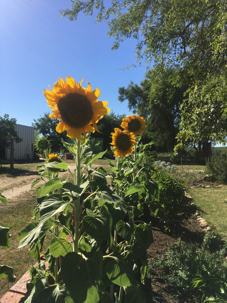 Sie leuchten schon von weitem! Die Sonnenblumen machen ihrem Namen alle Ehre und strecken ihre gelben Köpfe der Sonne entgegen. Vorausgesetzt, sie werden zweimal am Tag gegossen!
