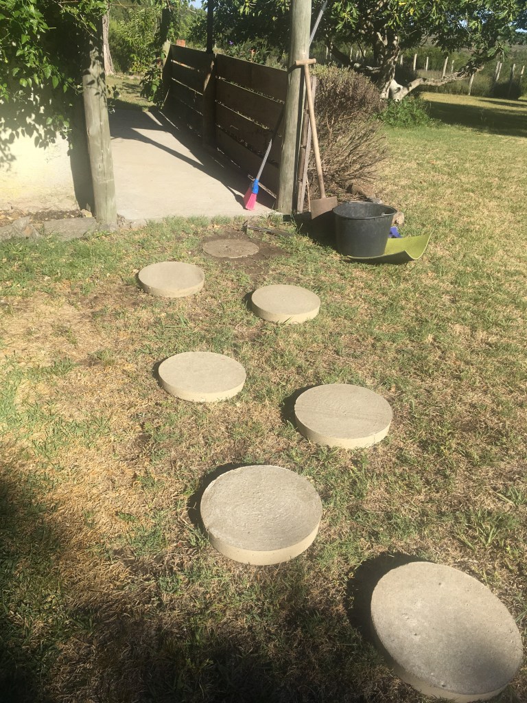 Die runden Betonplatten haben wir vor zwei Wochen gegossen. Jetzt sind sie ausgehärtet und können verbuddelt werden.