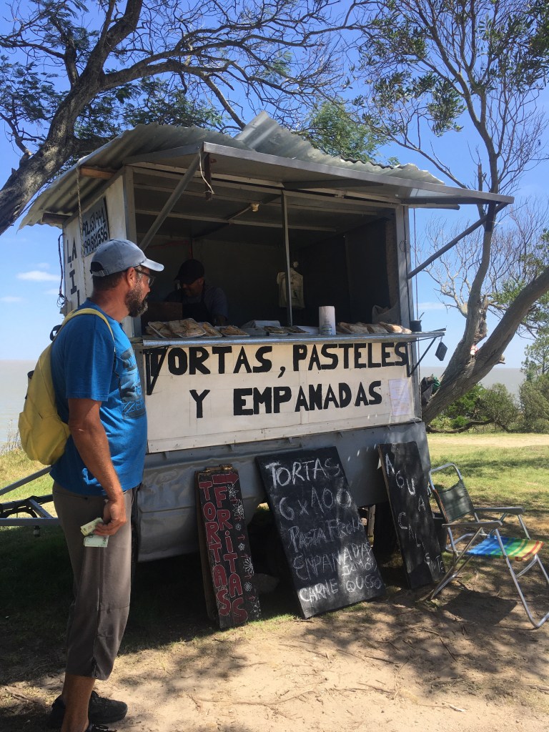 Es gibt Hamburger ( hamburguesas), Hotdog ( panchos), Hefeteigfladen in Fett ausgebacken ( tortas fritas ), gefüllte Teigtaschen ( empanadas ) und vieles mehr. Wir essen unterwegs immer gerne die tortas fritas, die gibt es immer und überall zu kaufen, auf jedem Markt, auf jedem Fest und an jeder Straße. Tortas fritas werden von der ärmeren Bevölkerung häufig gegessen. Sie sind einfach zu machen, billig in der Herstellung und machen satt. Es ist ein typisches Essen bei Regen, das gab es früher bei den Gauchos schon. Und wenn heute jemand erzählt, er hätte gestern tortas fritas gegessen, kommt unweigerlich die Frage: “Hat es geregnet?”