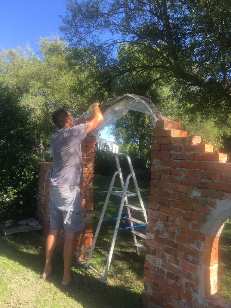 Die letzte Mauer bekommt noch einen schönen Durchgang. Steffen hat mittlerweile viel Übung und Erfahrung. Nach drei Tagen ist der Zement getrocknet und die Ziegel halten bombenfest.