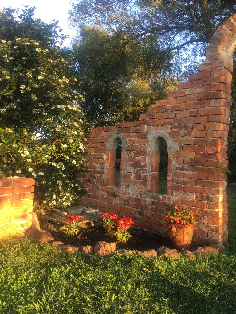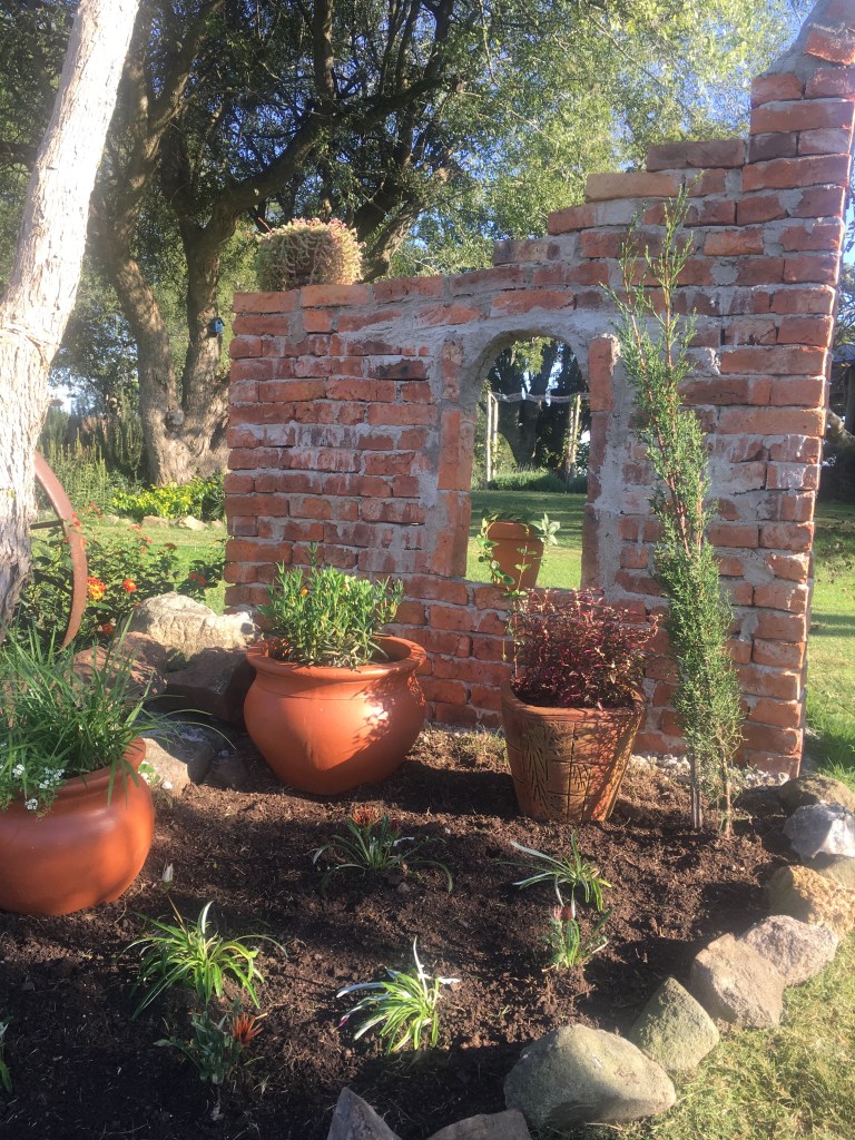 Die neuen Mauern wurden von beiden Seiten bepflanzt. Dort, wo der Boden für die Wurzeln zu steinig ist, haben wir große Töpfe hingestellt. In der Nacht werden sie von Solarlampen bestrahlt und eine lange Lichterkette gibt dem ganzen ein romantisches Flair.