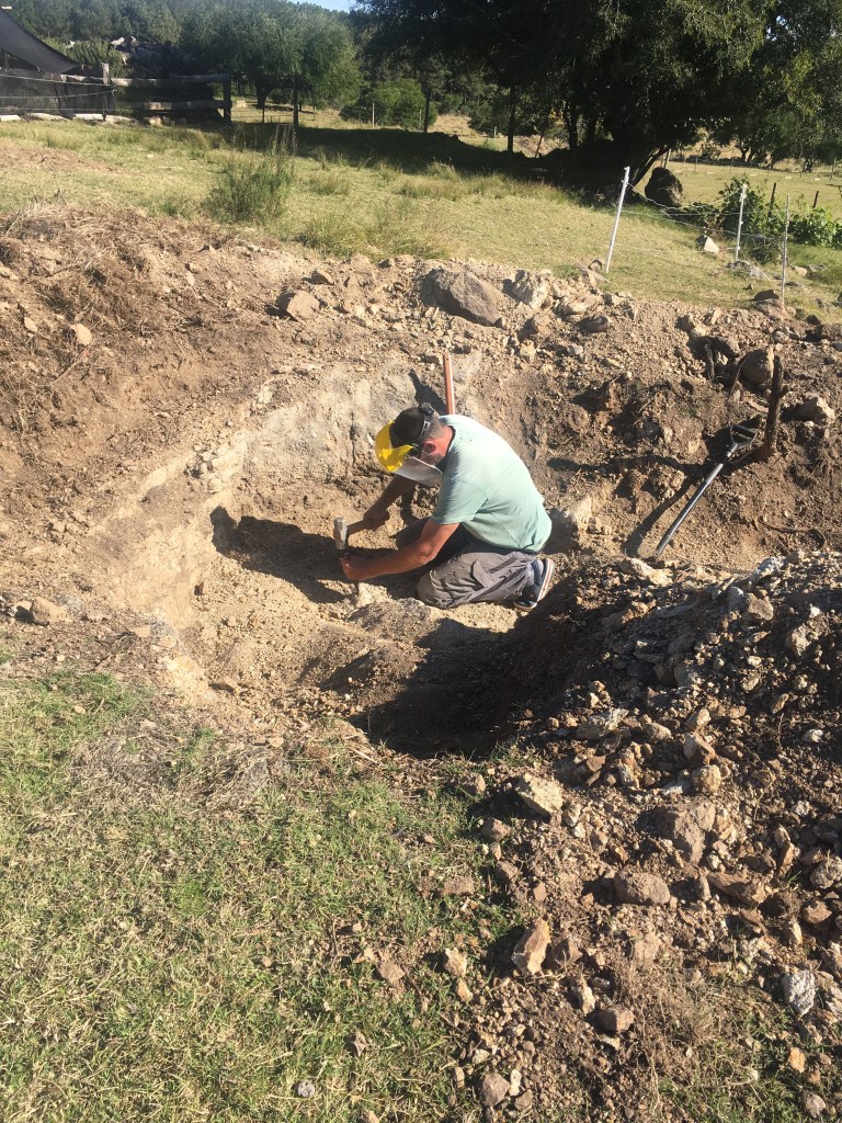 Hinter dem Haus, in einer natürlichen Senke, soll ein Keller entstehen. Die Senke hat das Regenwasser über Jahrzehnte hinweg ausgewaschen. Zurückgeblieben sind die Felsen, in die Steffen nun eine Art Stolleneingang hineinbaut, mit Hammer und Meisel, einer großen Brechstange und einer schweren Steinaxt. Das ganze Projekt liegt an einem Hang, sodass das Regenwasser gut ablaufen kann und der Keller, wenn er denn einmal fertig ist und eine stabile Decke hat, nicht voll Wasser läuft.