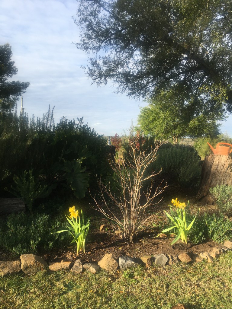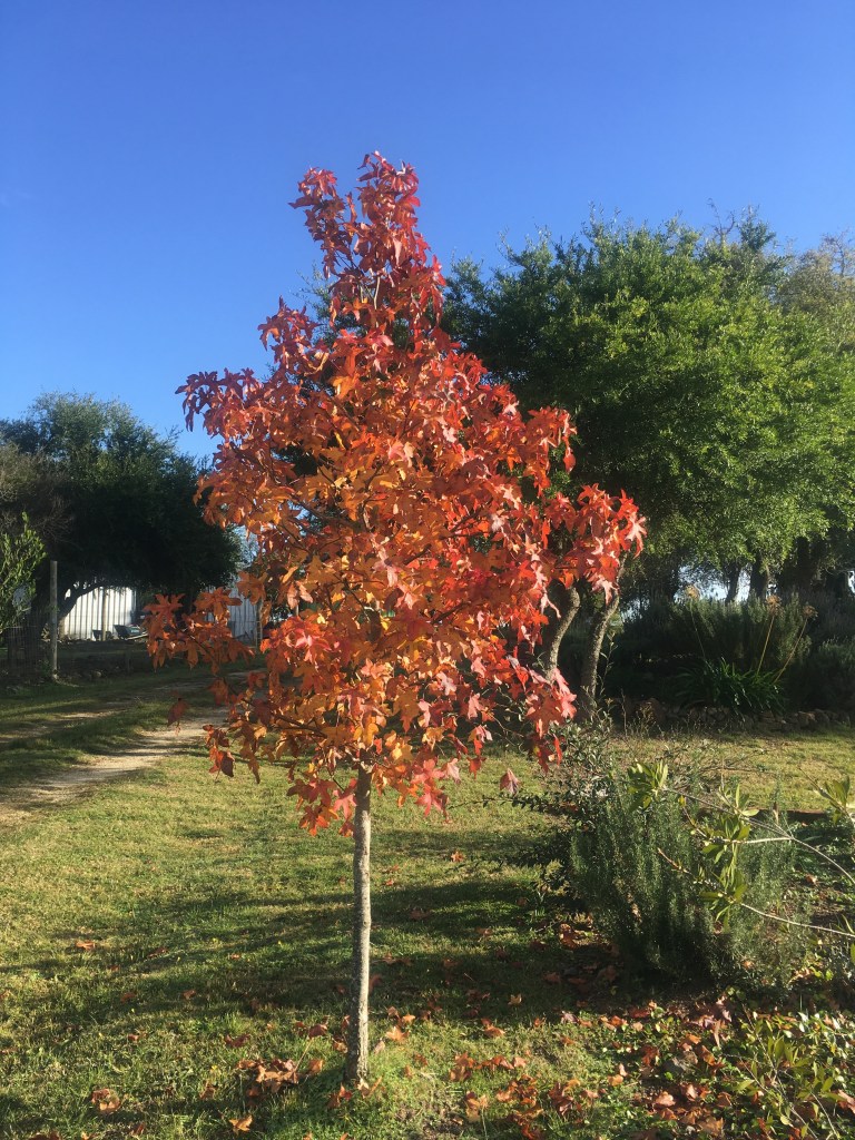 Während im Hintergrund die Ahornbäume im bunten Herbstlaub erstrahlen, blühen im Vordergrund die Osterglocken. Durch Zufall haben wir die hier äußerst seltenen Blumen auf dem Markt in Colonia entdeckt und gleich den ganzen Bestand, zwei Töpfe mit jeweils drei Blumenzwiebeln😁, aufgekauft.