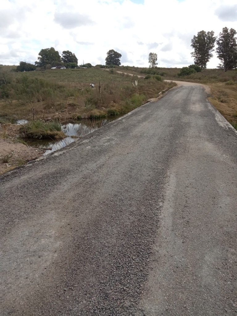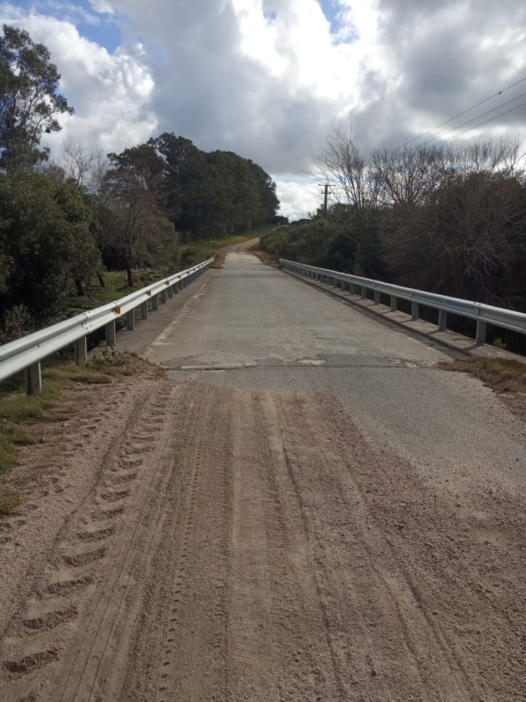 Immerhin waren die Brücken, über die wir kamen und die vom letzten Hochwasser beschädigt waren, wieder Instand gesetzt. Bei „unserer“ Brücke wird es noch etwas länger dauern. Als wir sie kurz nach 15 Uhr mehr schleichend als wandernd passierten, waren die Bauarbeiter schon weg und hatten ihre Maschinen fein säuberlich vor unseren Galpon gestellt. Da gehört wohl der Arbeitsweg zur Arbeitszeit!