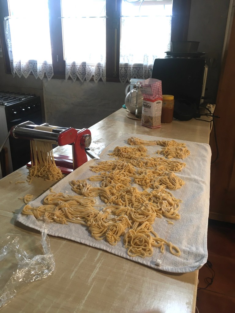 Und dann gibt es selbst gemachte Nudeln. Für die Teigherstellung ist Muskelkraft gefragt. Das ersetzt das Fitnessstudio. Mittlerweile habe ich Übung, auch das Ausrollen mit der kleinen Kurbelmaschine klappt ziemlich flott.