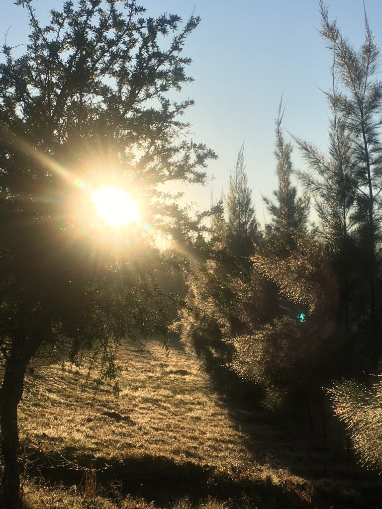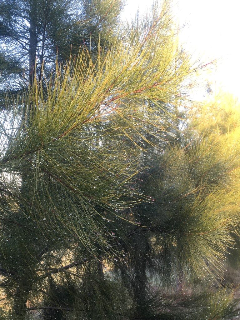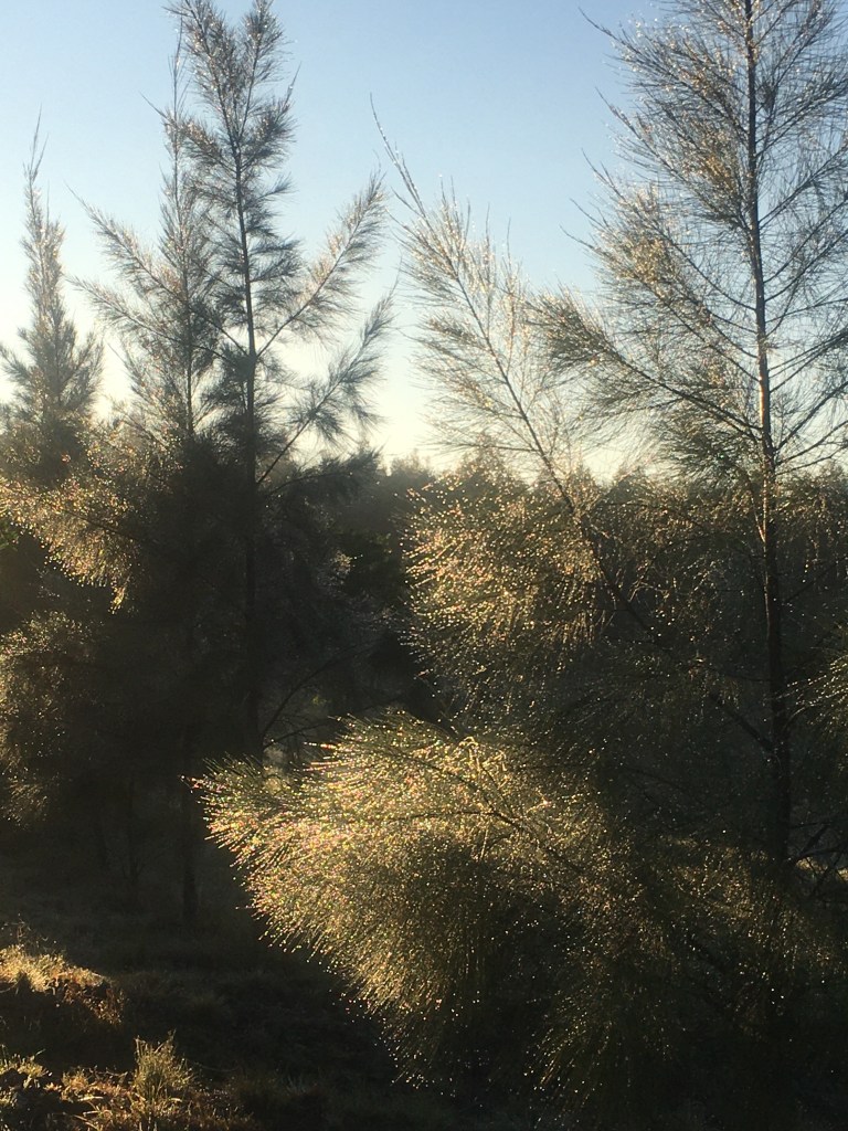 Die Sonne bringt die vielen Tautropfen zum Glitzern.