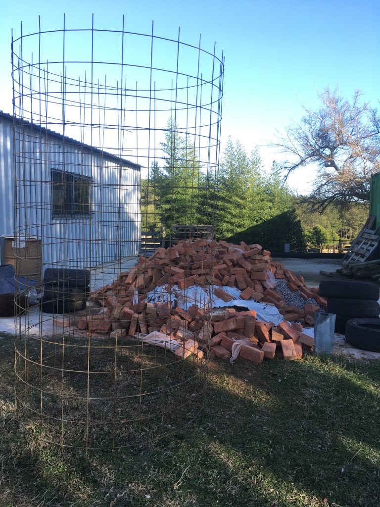 Endlich hat der Baustoffhandel die neuen Ziegel geliefert. Und Sand und Zement und Kieselsteine und.. und.. und. Das Drahtgeflecht im Vordergrund ist für die Dachkonstruktion von Steffens Keller.