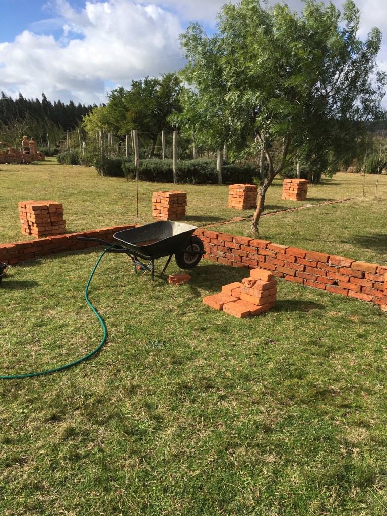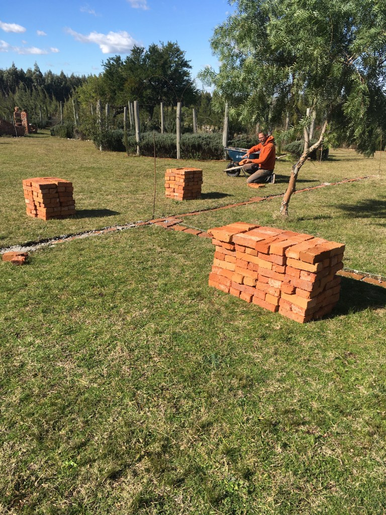 Obwohl die Ziegel wieder von fürchterlicher Qualität sind ( unterschiedlich groß, unterschiedlich schwer 🤔, einige glatt, die meisten porös….) , haben sie das Abladen, oder besser: Runterschütten vom LKW ganz gut überstanden. Der Bruch hält sich in Grenzen und wird in der Mauer mit verbaut. Wir finden es immer wieder erstaunlich und gruselig, dass hier mit so einem Material Häuser gebaut werden🙈. Aber der Beton hält alles sicher zusammen! Unser Haus steht ja auch noch!