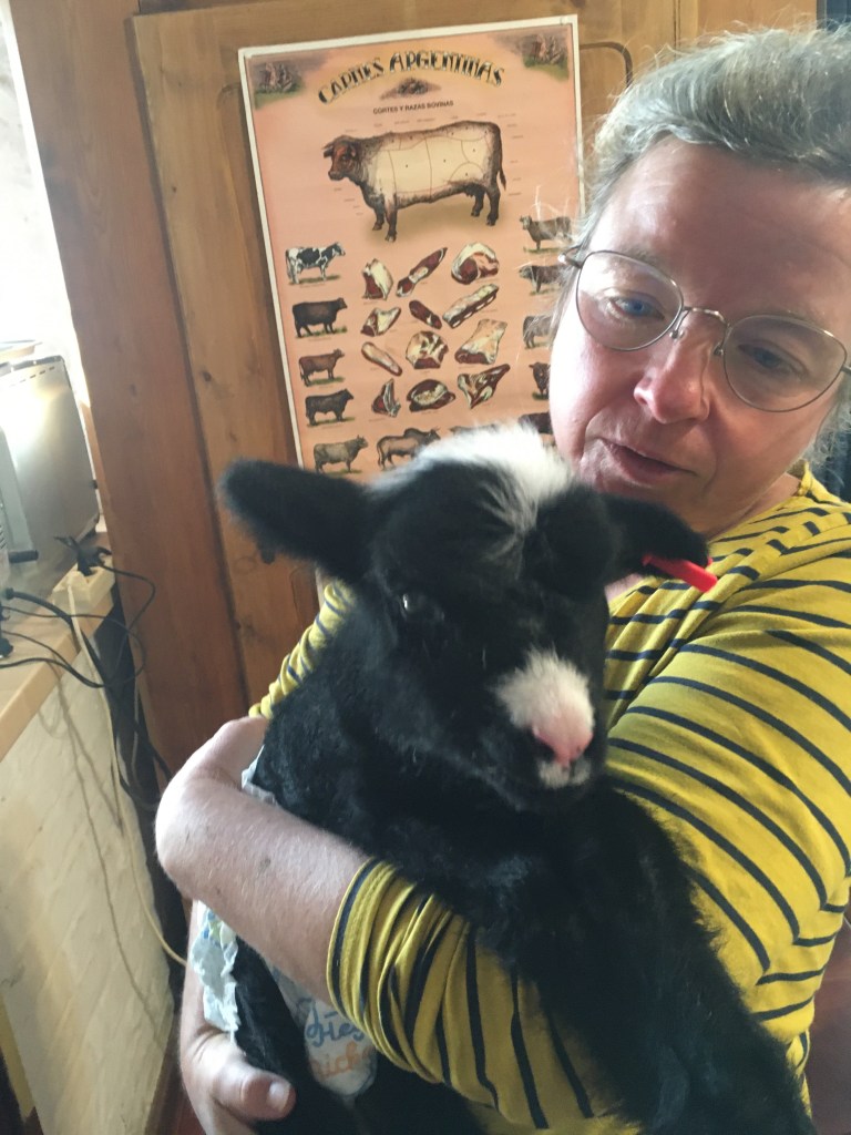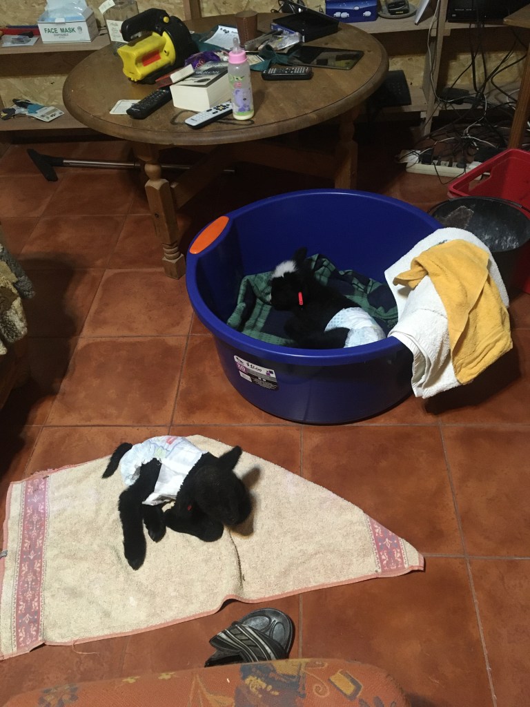 Ein Zwillingspärchen vom Donnerstag machte uns etwas Sorgen, die zwei waren unterschiedlich groß und wir beschlossen, das kleinere, das gegen den großen Bruder am Euter der Mutter keine Chance hatte, auch mit ins Haus zu nehmen. Unser zweites Flaschenlamm.