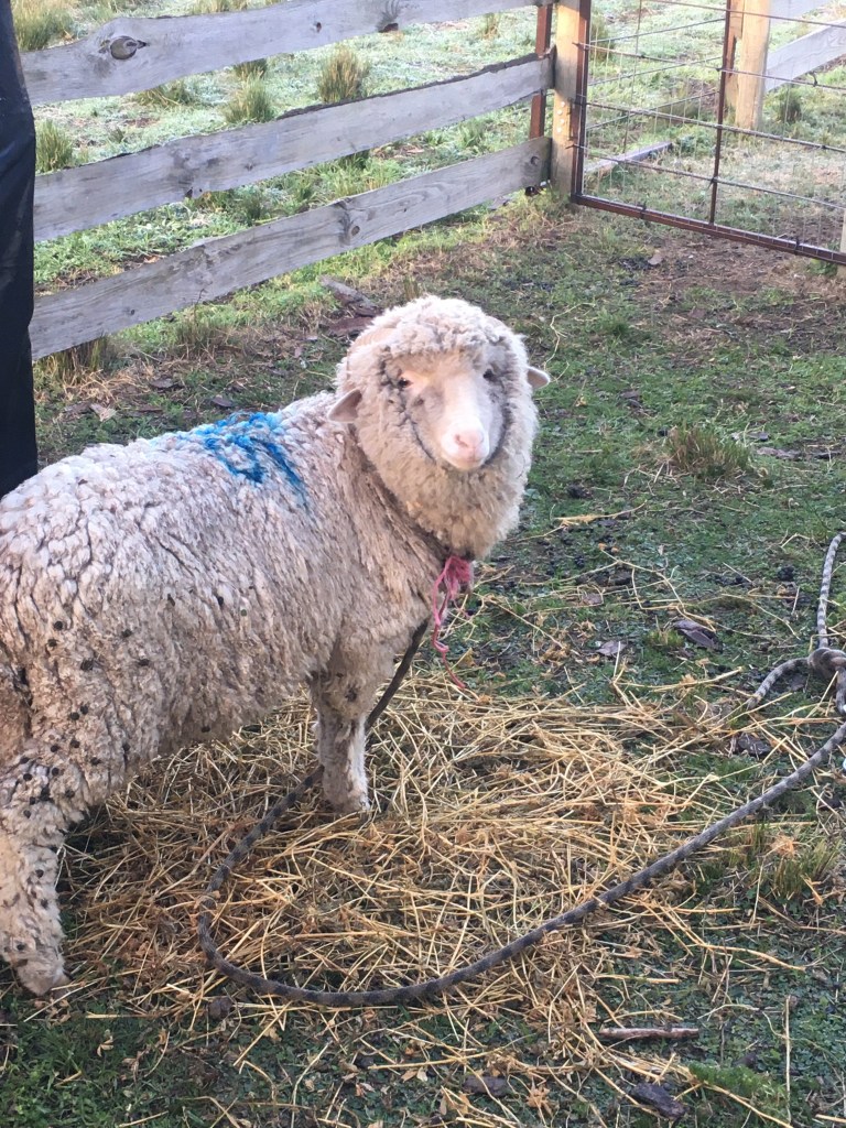 Tagsüber ist er an eine lange Leine gebunden und darf im Park und in der Einfahrt das gute frische Gras fressen. Damit wird er erst einmal aufgepäppelt, damit aus dem Hungerhaken ein kleines Dickerchen wird. Denn nach der Schur, wenn die ganze Wolle weg ist, wird man sonst die Knochen zählen können. Zusätzlich bekommt er täglich eine große Portion Mais.