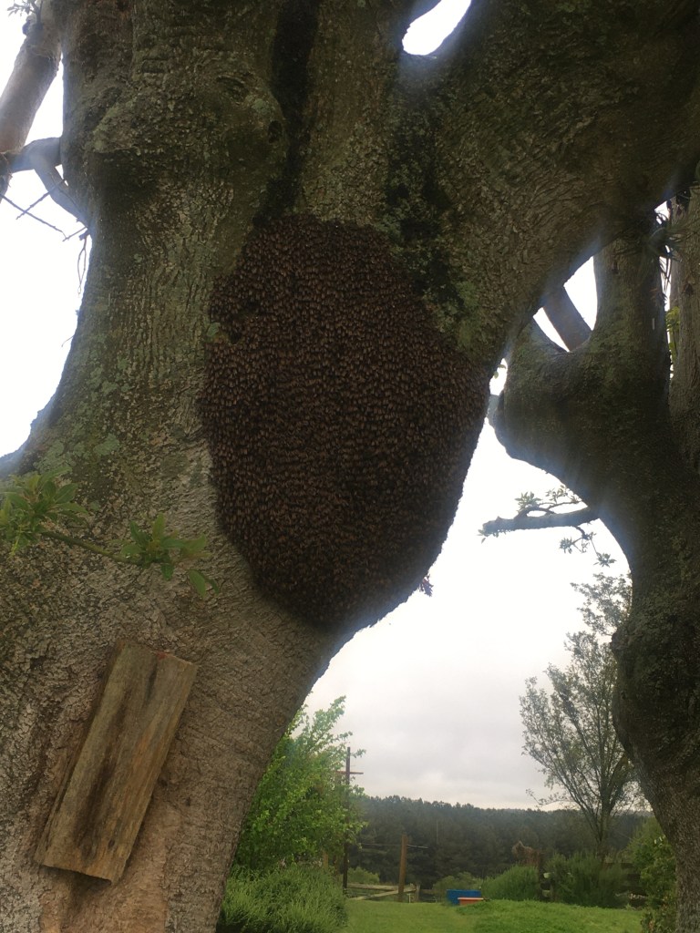 Vor einigen Tagen wurde ich beim Unkrautrupfen von einem Schwarm überrascht. Ich habe ihn aber schon von weiten kommen gehört und konnte mich in Sicherheit bringen. Sie sammelten sich am dicken Stamm des Ombu-Baumes und blieben dort erst einmal kleben. Die nähere Umgebung war für uns nun tabu. Wir hofften, dass sie am nächsten Tag wieder verschwinden würden.