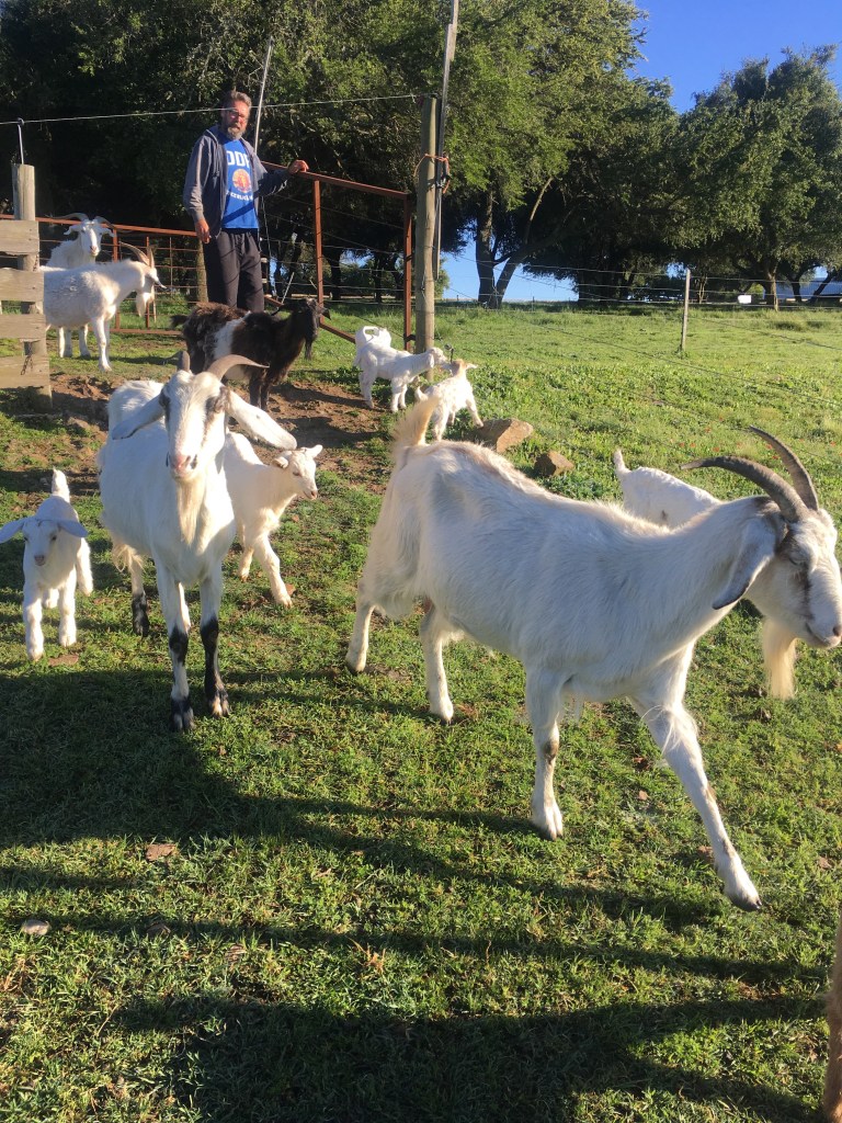Erst wenn Steffen auch die Ziegen aus ihrem Gehege lässt, kommt Bewegung in die Herde. Die Ziegen sind nicht so schmusebedürftig und rennen mit den acht Zicklein ungestüm hinaus. Wehe, wenn ein Schaf im Weg steht: das wir unsanft mit den Hörnern beiseite gestoßen!