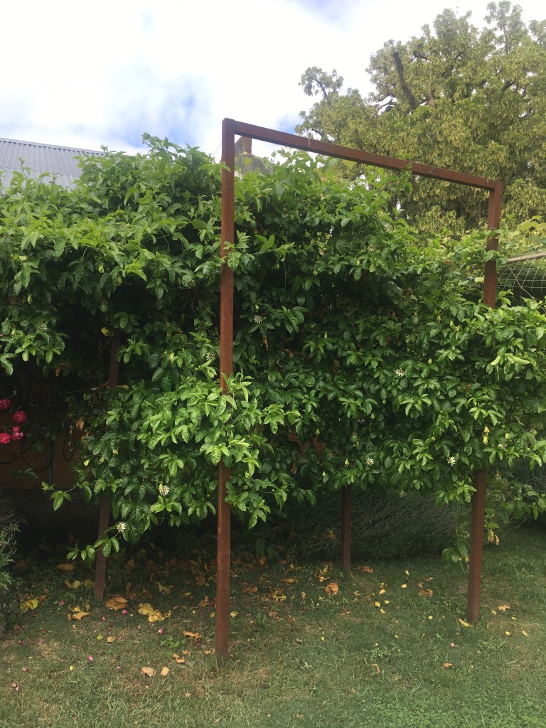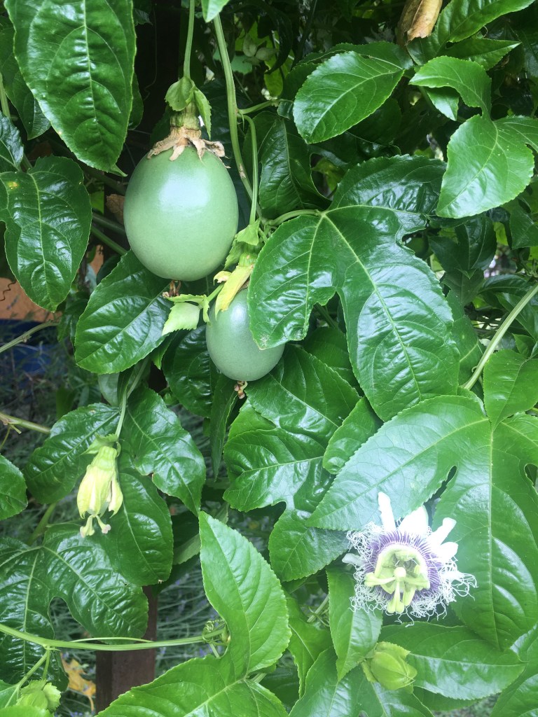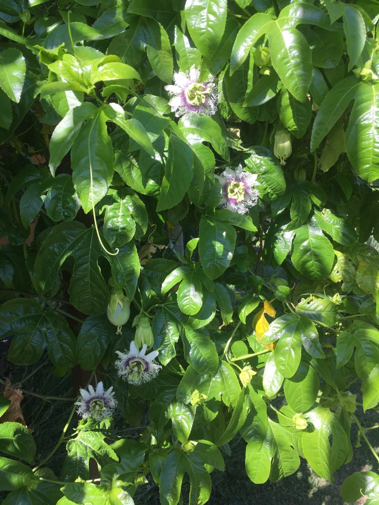 Unsere Maracuja-Planze wuchert munter weiter und hat das zweite Haltegestell mittlerweile auch komplett eingewachsen.