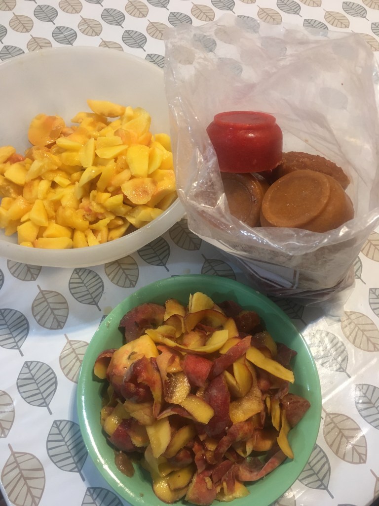 Auch Pfirsiche gibt es günstig zu kaufen. Unsere eigenen Bäume sind noch zu klein, als dass sie eine nennenswerte Menge abwerfen würden. Also haben wir einige Kilo gekauft und auch zu Obstmus verarbeitet. Die Schalen bekommen die Hühner, die freuen sich immer über eine leckere Abwechslung. Nächste Woche möchte ich dann noch Pfirsich- und Erdbeermarmelade einkochen.