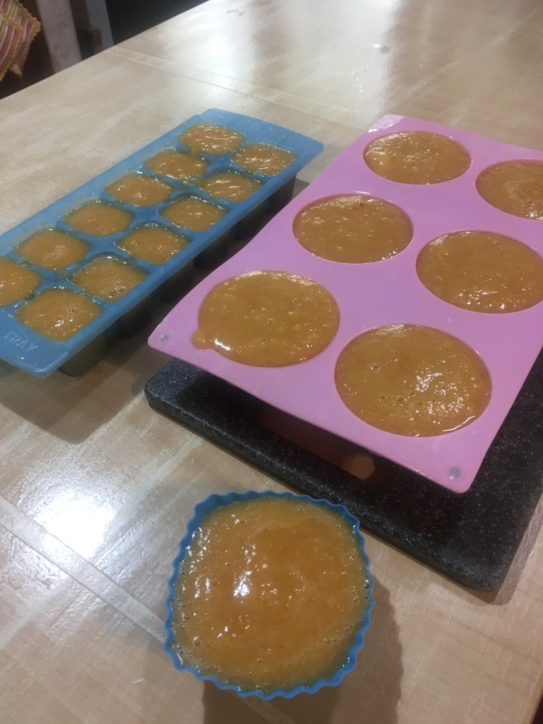 Unsere Aprikosen sind auch schon abgeerntet. Der Ertrag war nicht so üppig wie im letzten Jahr, dafür waren die Früchte mehr als doppelt so groß. Ich habe die Aprikosen dieses Jahr frisch püriert und portionsweise eingefroren. So haben wir morgens für das Müsli immer ein leckeres Fruchtmus. Die Würfel aus dem Eiswürfelbereiter ergänzen den frisch gepressten Orangensaft mit einer zusätzlichen Fruchtnote.