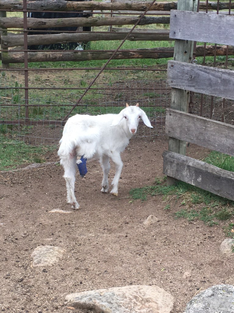 So konnten wir sofort eingreifen. Der Stumpf wurde fachgerecht verbunden. Um einen Wundbrand zu vermeiden, bekam die Ziege hochdosiert Antibiotikum gespritzt, das wir für Notfälle immer im Haus haben. Dann kam sie in die Krankenstation zur Beobachtung. Hier wird sie die nächsten Tage bleiben, auch wenn die kleine Dame damit nicht so ganz einverstanden ist. Sie ist es nicht gewohnt, alleine zu sein und ruft nach ihrer Herde. Ihr geht es den Umständen entsprechend recht gut. Sie frisst und ist in dem kleinen Gehege unterwegs. In einigen Tagen wird die Wunde verheilt sein, dann darf sie mit ihren Geschwistern wieder über die Weide springen.