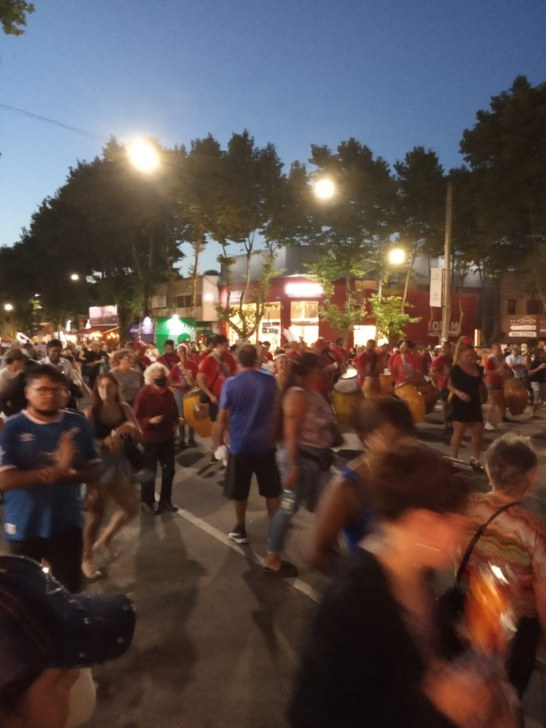 Eine traditionelle uruguayische Candombe-Gruppe zog lautstark durch die Stadt. Candombe sind handgemachte Trommeln in verschiedenen Größen und auch die Musik, die sich von den afrikanischen Sklaven aus dem vorletzten Jahrhundert bis heute überliefert hat. Mischlinge, deren Vorfahren sich bis in die Sklavenzeit zurückverfolgen lassen, halten die Traditionen aufrecht. Bei Veranstaltungen, und auch regelmäßig am Samstagabend, ziehen verschiedene Gruppen vor allem in Montevideo durch die Straßen. Der Rhythmus geht ins Blut. Tänzerinnen begleiten die Trommler und begeistern die Zuschauer.