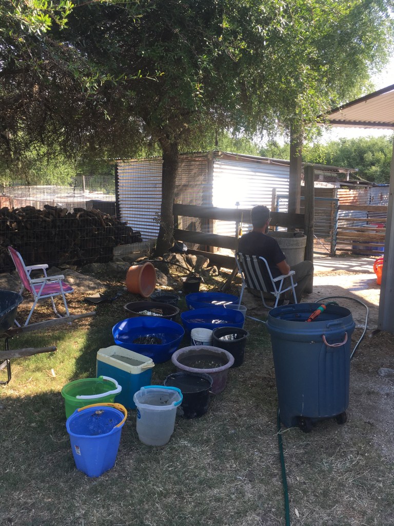 Dann wurden unzählige Wasserkanister gefüllt und im Abstand von 1,5 Metern im kleinen Gehege verteilt. Löschwasser, wenn das Feuer über die Wiese kommt.