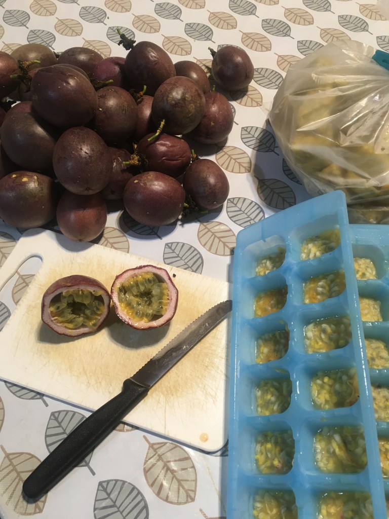 Bis jetzt haben wir 94 Maracuja geerntet, und das ist längst noch nicht alles. Das Ungetüm hängt noch voll mit Früchten, unsere diesjährige Strichliste hat noch Luft nach oben.